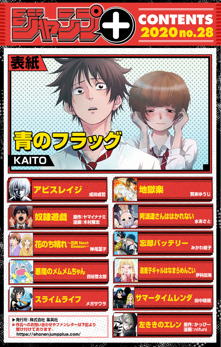 少年ジャンプ ジャンプ デジタル雑誌版年28号ラインナップ 青のフラッグ 地獄楽 阿波連さんははかれない 忘却バッテリー 道産子ギャルはなまらめんこい サマータイムレンダ 左ききのエレン アビスレイジ 奴隷遊戯 花のち晴れ 花男 Next Season